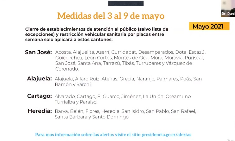 Este cierre se aplicará en la Gran Área Metropolitana (GAM), el cual iniciará el lunes 3 y finalizará el domingo 9 de mayo. Según las autoridades, estas nuevas medidas tienen como objetivo principal disminuir los contagios por COVID-19 que han tenido un aumento exponencial en los últimos días.