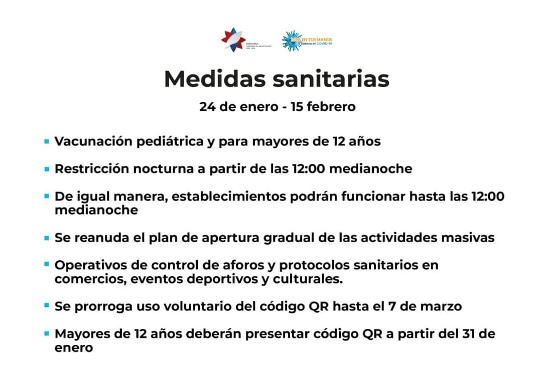 Las medidas se aplicarán del 24 de enero y hasta el 15 de febrero será la restricción nocturna para todo el país, de lunes a domingo de 12:00 meridiano a las 5:00 de la mañana y la diurna entre semana, aplica únicamente al anillo de circunvalación de San José.