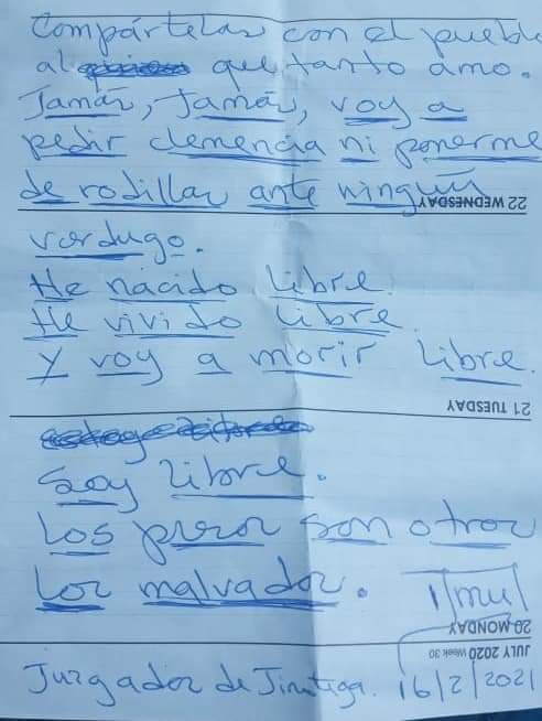 “Jamás voy a pedir clemencia ni ponerme de rodilla ante ningún verdugo, he nacido libre, he vivido libre y voy a morir libre… quizás estas sean las últimas palabras que recibas de mi”.