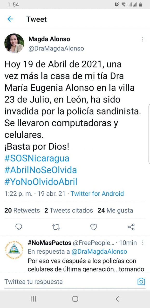 Unos 60 agentes orteguistas abordo de 5 patrullas y varios motorizados allanaron en León la vivienda de la doctora María Eugenia Alonso, reconocida opositora y precandidata a la presidencia de Nicaragua, este lunes 19 de abril.