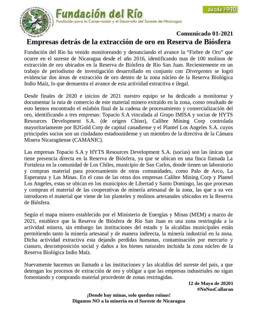 El organismo resaltó que la Reserva de Biósfera de Río San Juan es una zona restringida a la actividad minera, según el mapa minero establecido por el Ministerio de Energías y Minas (MEM) a marzo de 2021, sin embargo las instituciones del estado y la alcaldías municipales están permitiendo tanto la minería artesanal y de manera indirecta, la minería industrial en la zona.