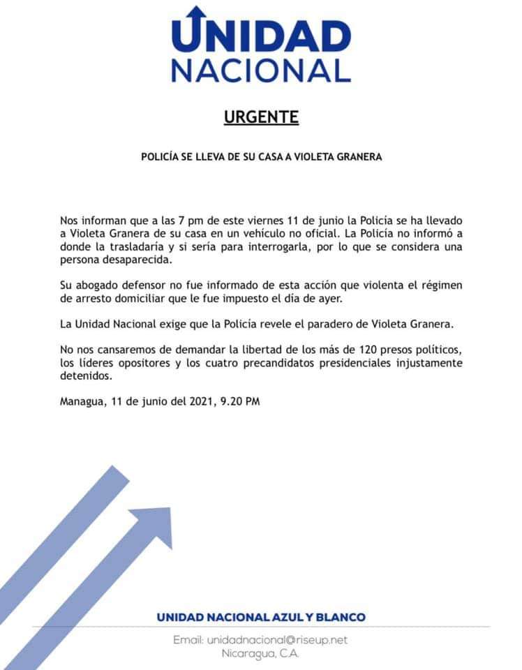 “La Unidad Nacional exige que la Policía revele el paradero de Violeta Granera’, dice el comunicado de la Unidad Azul y Blanco , quienes han considerado a la opositora como una “persona desaparecida”.