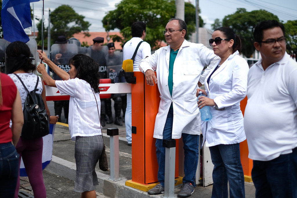 El gremio médico establece en su denuncia que durante las protestas del año 2018 el régimen prohibió brindar atención médica en el sistema estatal de salud a los opositores a su gobierno; esto ocasionó que el gremio médico se volcara a atender a la población en iglesias, universidades y consultorios improvisados en los barrios de las ciudades, lo que evitó un mayor número de muertos entre la población que protestaba en ese momento. Se calcula que entre 320 y 600 personas perdieron la vida por acción de las fuerzas del régimen, así como miles de heridos por armas de fuego.