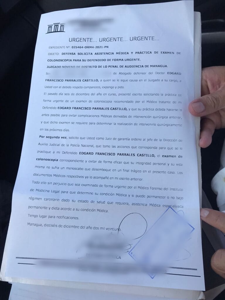 El abogado defensor del exembajador Edgard Parrales, reo de conciencia de la dictadura de Daniel Ortega, refirió que ha solicitado a las autoridades judiciales, la pronta valoración médica de este, con carácter de urgencia,  por la afectación delicada que padece el reo político, pero que sólo responden con un “silencio absoluto”.