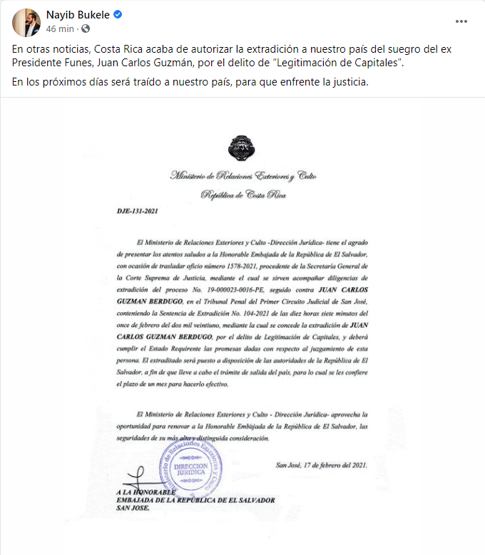Al igual que Funes, Juan Carlos Guzmán, estaba siendo requerido y acusado por por el delito de “Legitimación de Capitales” por la justicia salvadoreña y no fue sino hasta la tarde de este miércoles que se autorizo de parte de Costa Rica su extradición, el cual será puesto a la orden de las autoridades para el debido proceso judicial.