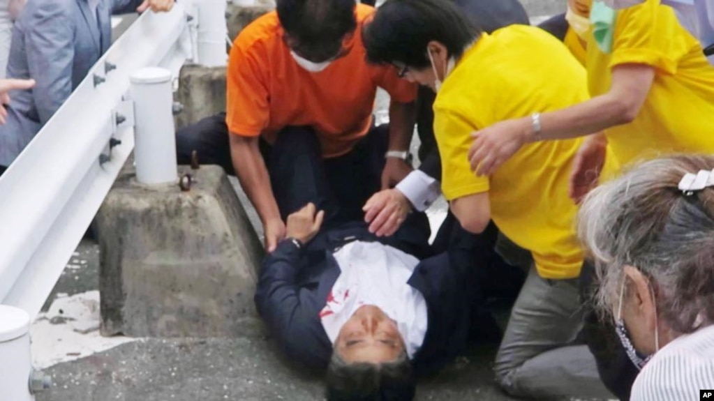 La emisora pública NHK transmitió un video dramático de Abe dando un discurso frente a una estación de tren en la ciudad occidental de Nara. Está de pie, vestido con un traje azul marino, levantando el puño, cuando se escuchan dos disparos. Luego, el video muestra a Abe colapsado en la calle, con los guardias de seguridad corriendo hacia él. Se sujeta el pecho, la camisa manchada de sangre.