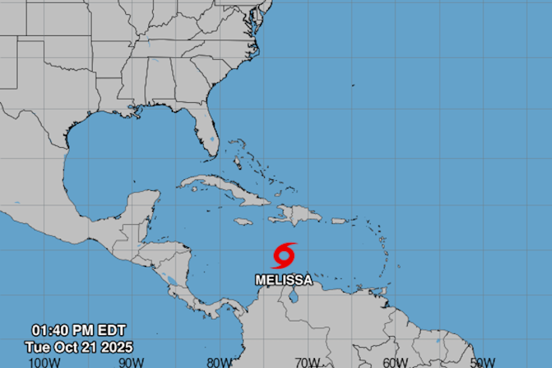 La Tormenta Tropical Melissa el 21 de octubre de 2025, ubicada por el NHC.