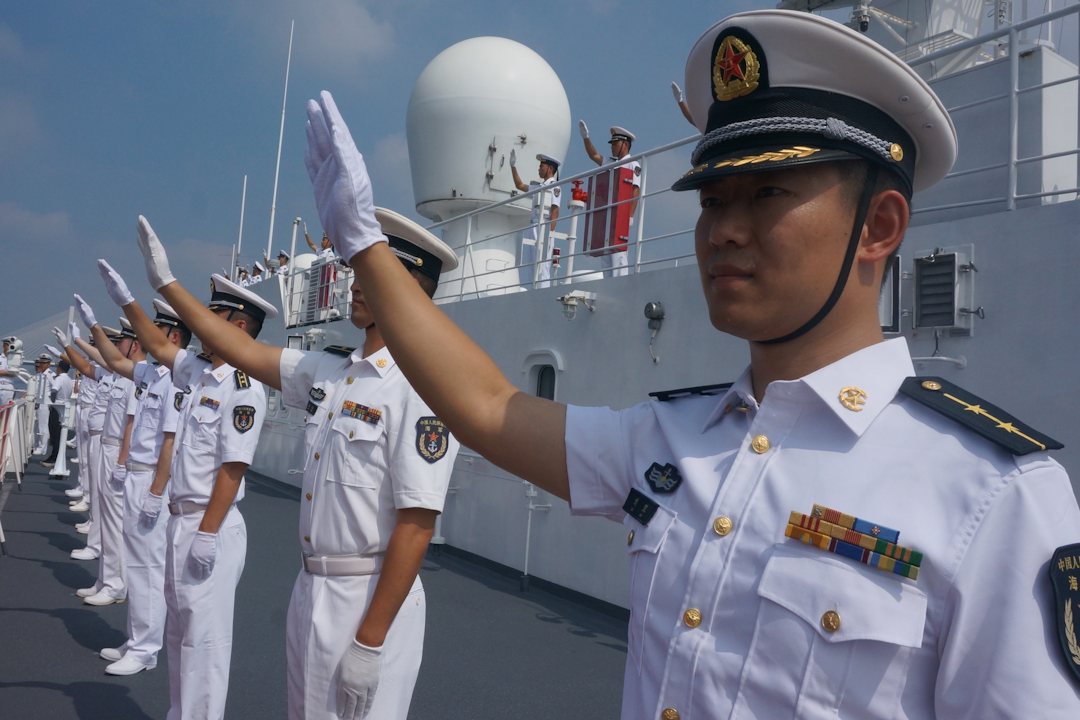 Marines chinos saludan a una multitud al zarpar el Ark Silk Road el 5 de septiembre, 2025, rumbo a 12 países en una misión humanitaria.