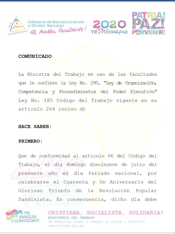 “La ministra del trabajo le ha hecho llegar al comandante Daniel y el comandante Daniel nuestro presidente ha autorizado un comunicado que de conformidad al artículo 66 del código del trabajo establece que cayendo el feriado nacional 19 de julio en día domingo, el día lunes se toma como día de descanso con goce de salario para reponer el feriado que cae en domingo que tradicionalmente, que siempre es feriado de descanso obligatorio” dijo Murillo.