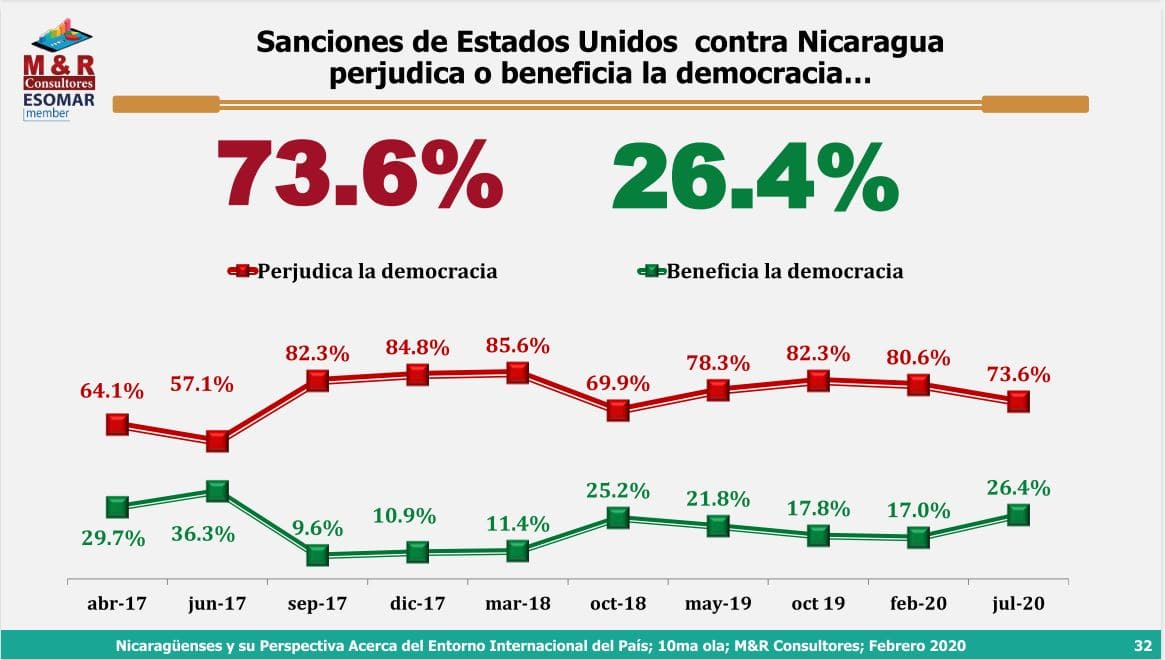 Esta encuestadora presentó las sanciones de Estados Unidos como “Sanciones contra Nicaragua” y no como sanciones dirigidas a personas individuales, y también entidades públicas y privadas, en los que un 73.6% cree que las medidas unilaterales de los Estados Unidos, y ha calificado como sanciones “contra Nicaragua” son perjudiciales para la democracia del país y que un 85.4% piensa que perjudica también al pueblo y no solo al gobierno.