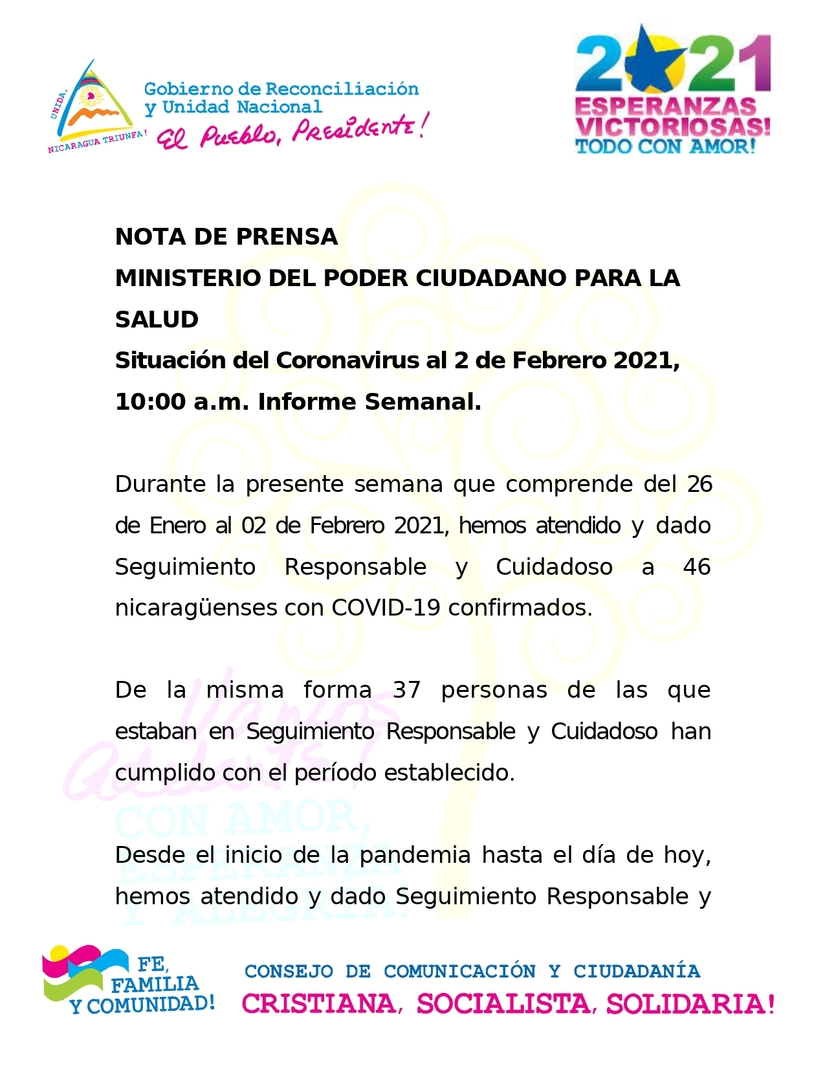 Entre el 26 de enero y el 2 de febrero del 2021, reportan 46 nicaragüenses con COVID-19 confirmados.