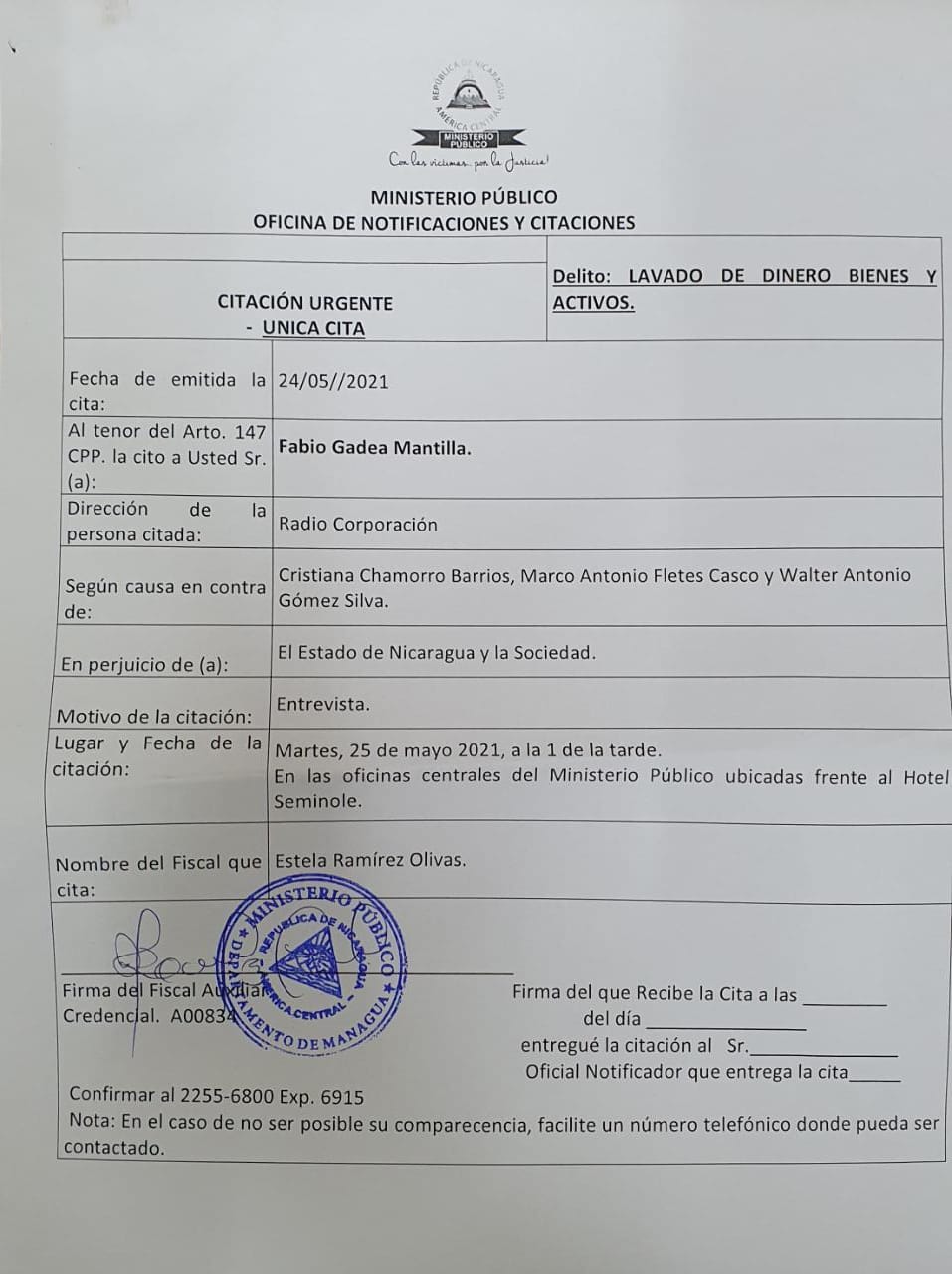 Esta tarde se dio a conocer la citatoria con carácter de urgencia que recibió el empresario radial y director de Radio Corporación, Fabio Gadea Mantilla, por el caso de supuesto lavado de dinero con la Fundación Violeta Barrios de Chamorro.