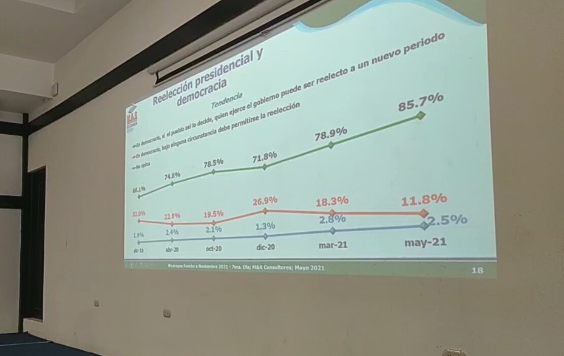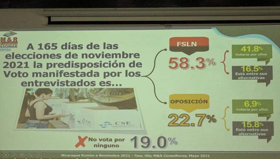 Este martes la empresa encuestadora M&R Consultores presentó los resultados de la encuesta “Nicaragua, Rumbo a Noviembre 2021” 7.ª Ola, cuyos resultados supuestamente revelan que a 165 días de las elecciones de noviembre con una muestra de 1,613 personas, el 58.3% de los nicaragüenses votaría por el Frente Sandinista de Liberación Nacional (FSLN).