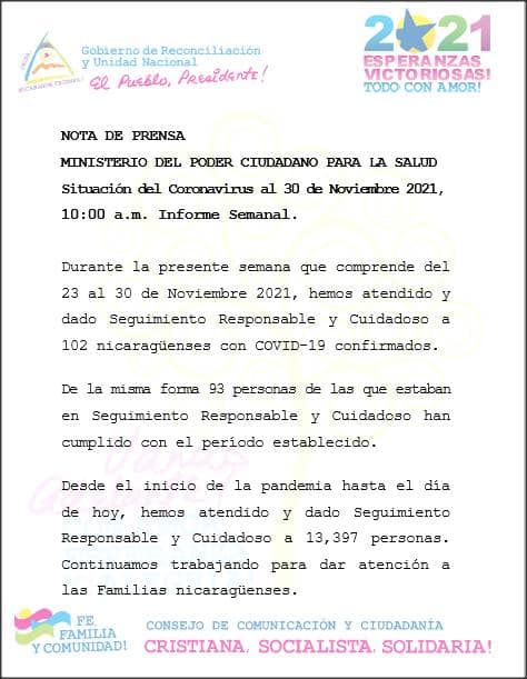 “Durante la presente semana que comprende del 23 al 30 de noviembre 2021, hemos atendido y dado Seguimiento Responsable Cuidadoso a 102 nicaragüenses con Covid-19 confirmados”, se lee en el comunicado.