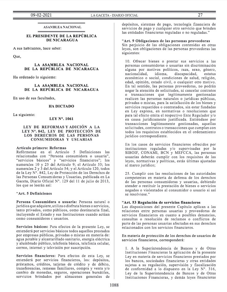 Este martes 09 de febrero entró oficialmente en vigencia la “Ley de Protección de los Derechos de las personas consumidoras y usuarias”, Ley 842, la cual es efectiva a partir de su publicación en el diario oficial La Gaceta.