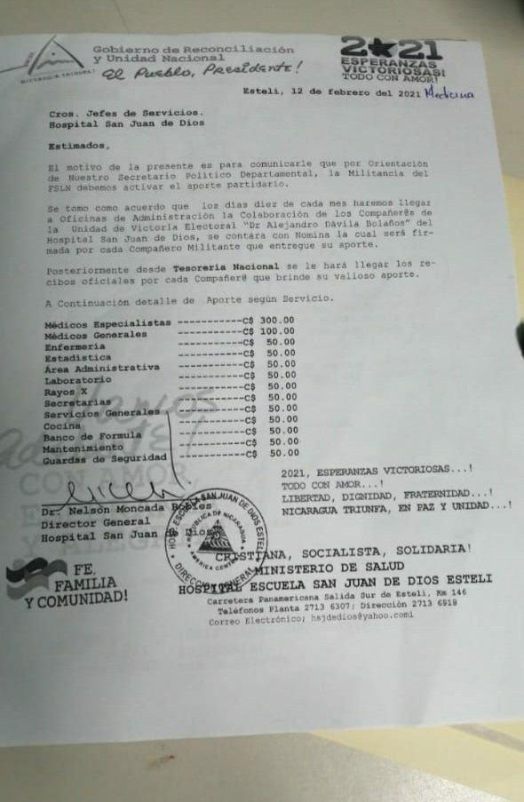 En una circular que se filtró del recién pasado mes, el secretario político departamental de Estelí, recuerda a todos los trabajadores de todas las áreas del Hospital San Juan de Dios, de ese departamento del norte del país, a continuar “aportando” de su salario para el partido FSLN.