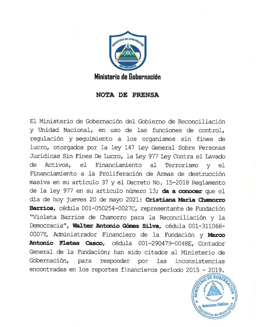 En el documento refiere que “en uso de las funciones de control regulación y viento a los organismos sin fines de lucro otorgados por la ley 147, Ley General sobre Personas Jurídicas sin fines de lucro, la ley 977, Ley contra el lavado de activos el financiamiento al terrorismo y el financiamiento a la proliferación de armas de destrucción masiva, en su artículo 37 y decretó 15 2018 reglamentos de la ley 977 en su artículo número 13 de conocer que el día de jueves 20 de mayo 2021, Cristiana María Chamorro Barrios Representante de la Fundación Violeta Barrio de Chamorro para la Reconciliación la Democracia, Walter Antonio Gómez Silva, Administrador financiero de la Fundación y Marcos Antonio Flete Casco, contador general de la Fundación han sido citados al Ministerio de Gobernación para responder por las inconsistencias encontradas en los reportes financieros 2015 2019′.