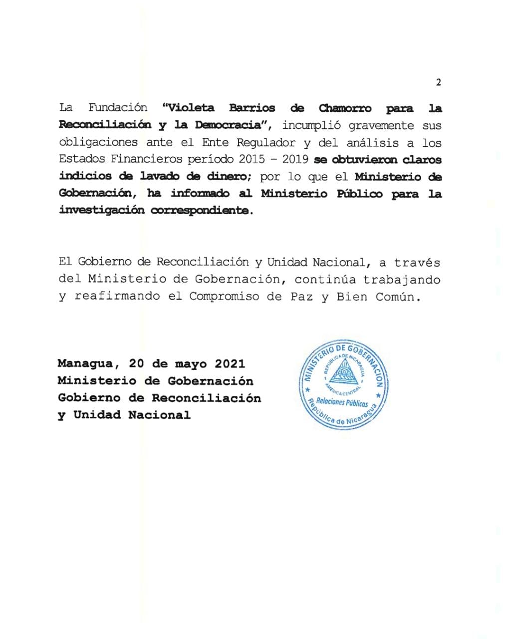 “La Fundación Violeta Barrios de Chamorro para la Reconciliación la Democracia, incumplió gravemente sus obligaciones ante el ente regulador y del análisis a los estados financieros pedidos 2015-2019 se obtuvieron claros indicios de lavado de dinero, por lo que el Ministerio de Gobernación a informado al Ministerio Público para la investigación correspondiente”, dice la nota del sandinista Ministerio de Gobernación.