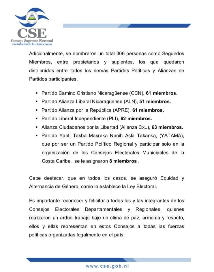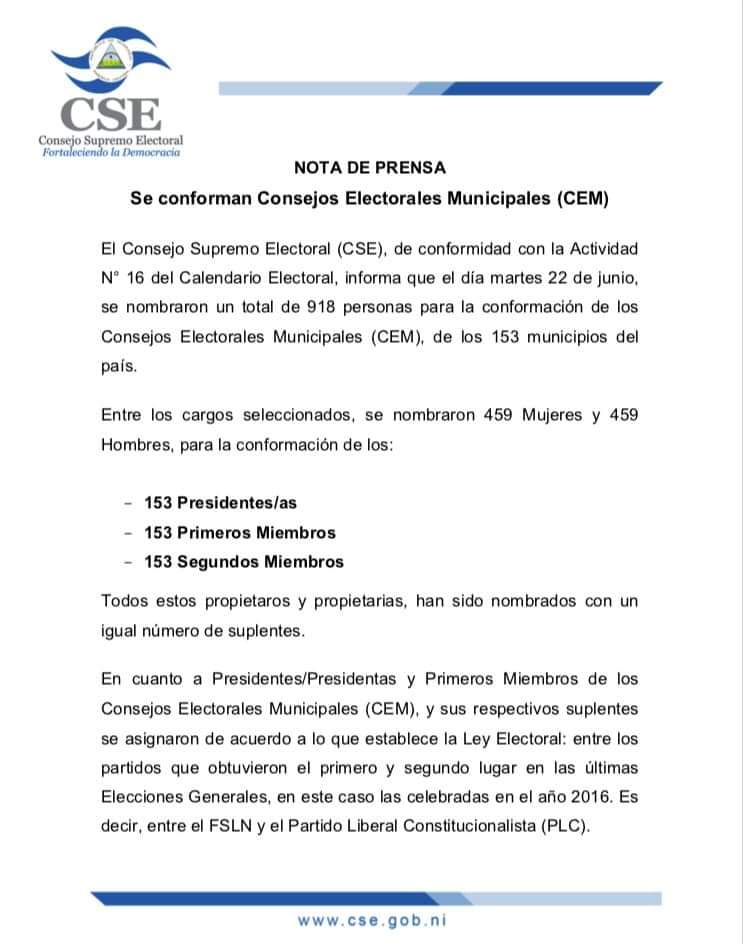 “En cuanto a Presidentes/Presidentas y Primeros Miembros de los Consejos Electorales Municipales (CEM), y sus respectivos suplentes se asignaron de acuerdo a lo que establece la Ley Electoral: entre los partidos que obtuvieron el primero y segundo lugar en las últimas Elecciones Generales, en este caso las celebradas en el año 2016. Es decir, entre el FSLN y el Partido Liberal Constitucionalista (PLC)”, reza la nota de prensa en su página web.