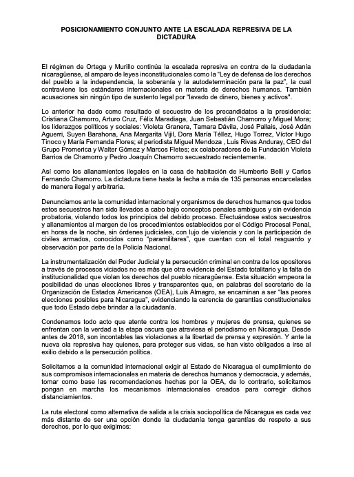 Un total de 34 organizaciones civiles, políticas y opositores se manifestaron por medio de un comunicado en el que denuncian el incremento de las violaciones a los Derechos Humanos, las detenciones arbitrarias de precandidatos, dirigentes políticos y periodistas, así como la persecución de la Prensa Independiente que desató de nueva cuenta la administración sandinista.
