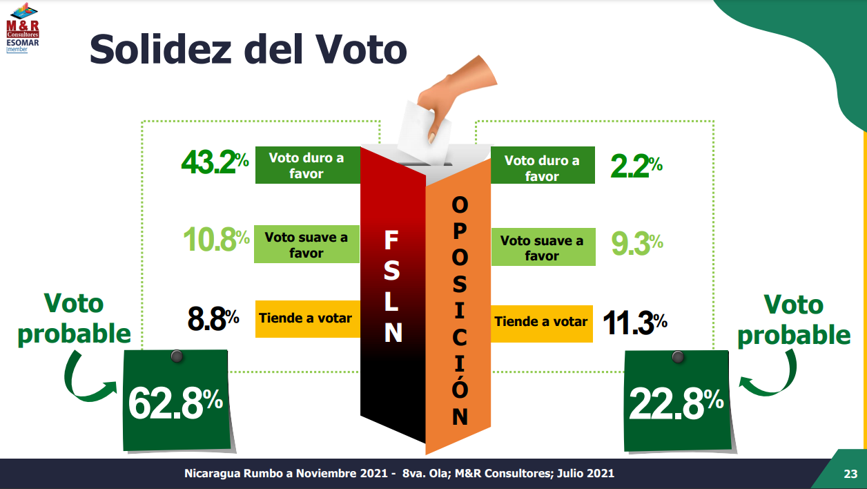 La polémica firma encuestadora M&R consultores quien siempre ha dado una gran ventaja en intención de votos al Frente Sandinista de Liberación Nacional dio a conocer sus últimos resultados de sondeos de opinión de cara a las elecciones generales de este 7 de noviembre, las cuales han sido desde ya cuestionadas por la comunidad internacional, ya que su proceso se enmarcan en un “panorama oscuro”.