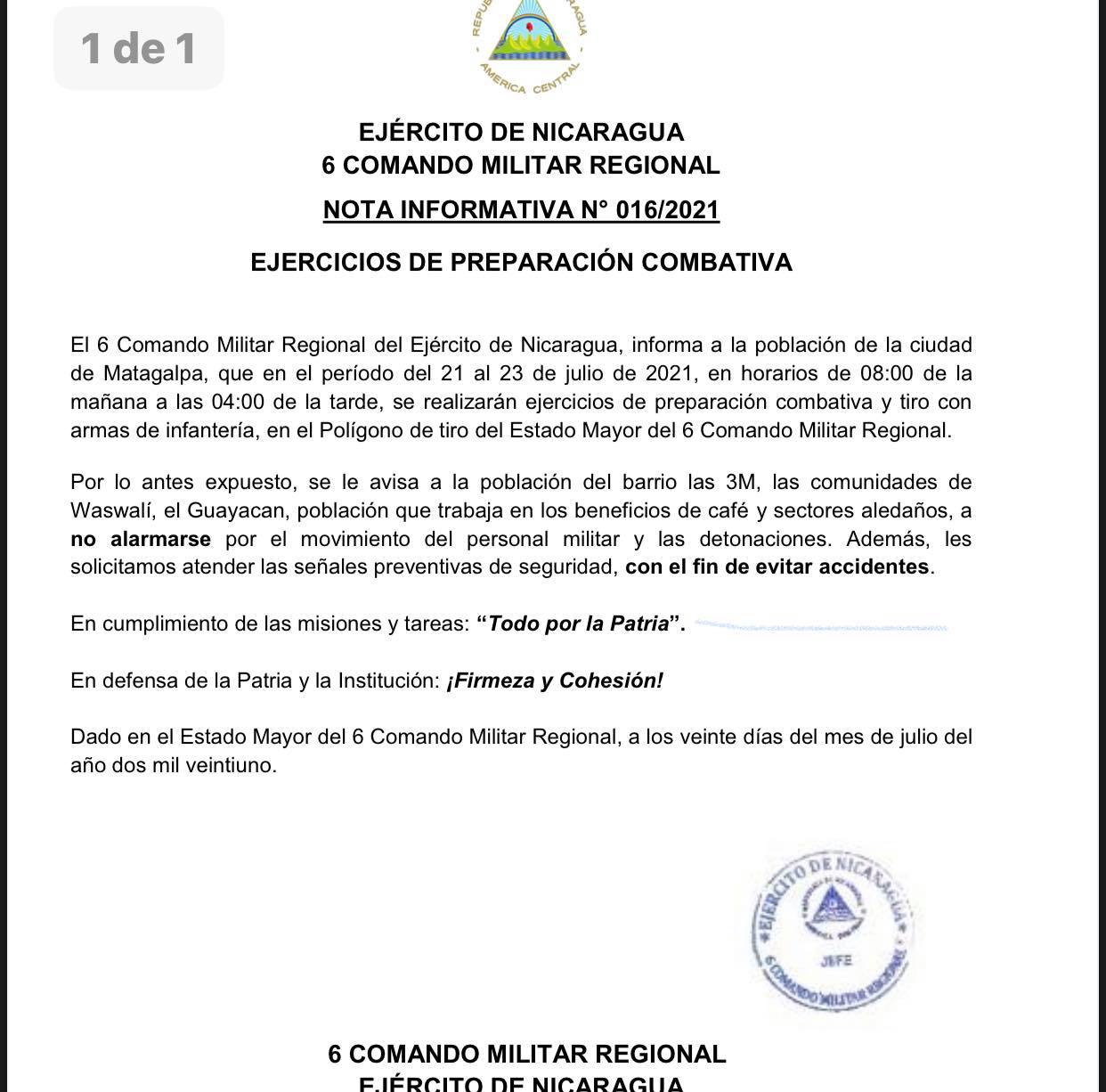 El Ejército de Nicaragua, de afinidad sandinista, informó a través de un comunicado, que en el período del 21 al 23 de julio estará realizando ejercicios de “preparación combativa y tiro con armas de infantería”, por lo que advierte a la población no alarmarse.