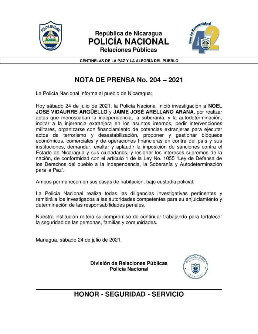 La Sancionada policía sandinista inició este sábado una investigación en contra del precandidato presidencial Noel Vidaurre y el comentarista Jaime Arellano, luego que salieran de una citatoria girada por la Fiscalía General de la República donde ambos se presentaron sin conocer las razones. Según la policía ambos permanecen en sus casas de habitaciones “bajo custodia […]
