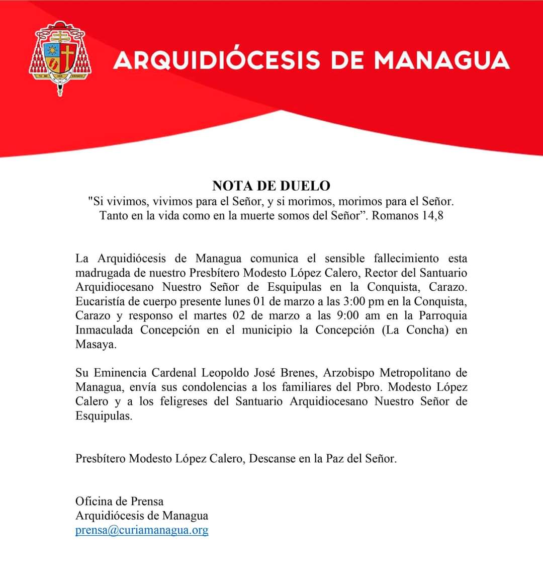 Por su parte las autoridades de la Arquidiócesis de Managua lamentaron el deceso del sacerdote Modesto López, a la vez que invitó a la feligresía, a participar de la homilía de cuerpo presente, hoy en La Conquista y al responso el dia de mañana, en el municipio de La Concepción, Masaya, de donde era originario el religioso.
