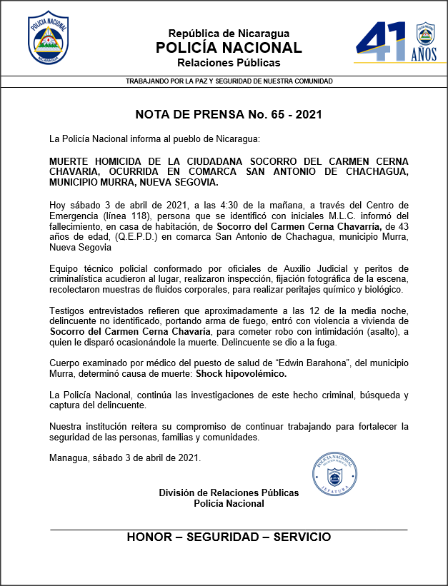 “Hoy sábado 3 de abril de 2021, a las 4:30 de la mañana, a través del Centro de Emergencia (línea 118), persona que se identificó con iniciales M.L.C. informó del fallecimiento, en casa de habitación, de Socorro del Carmen Cerna Chavarría, de 43 años de edad, (Q.E.P.D.) en comarca San Antonio de Chachagua, municipio Murra, Nueva Segovia”, dice la nota.