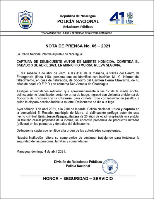 La División de Relaciones Públicas de la Policía Sandinista dio a conocer, en una nota de Prensa, de la captura del supuesto homicida Ervin Josué Vásquez Herrera, de 20 años de edad, este sábado 3 de abril 2021, a la 2:00 de la tarde, a quien ubicó y capturó en la comunidad El Rosario, municipio de Murra.