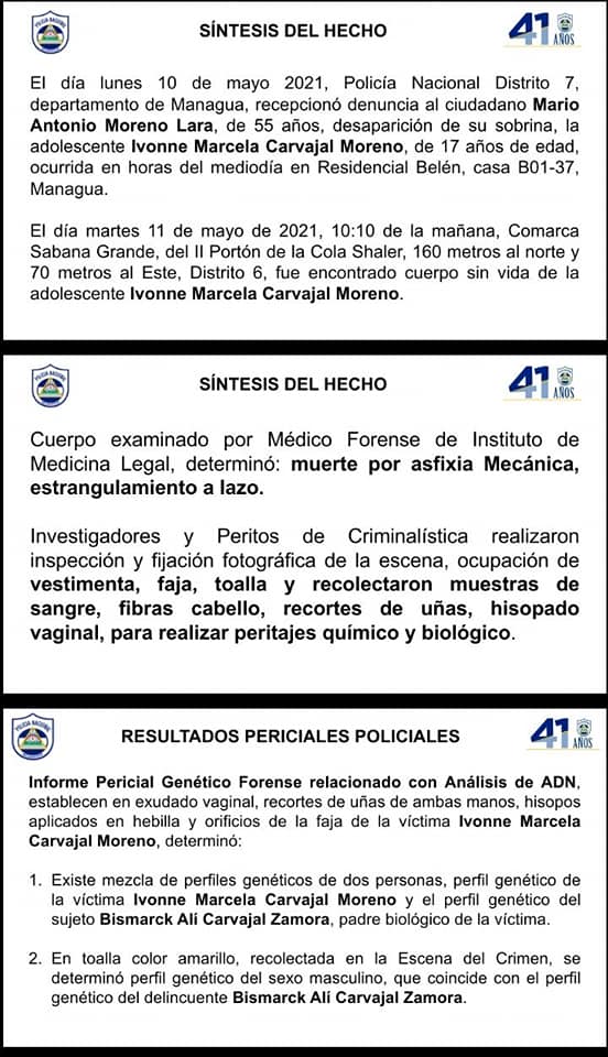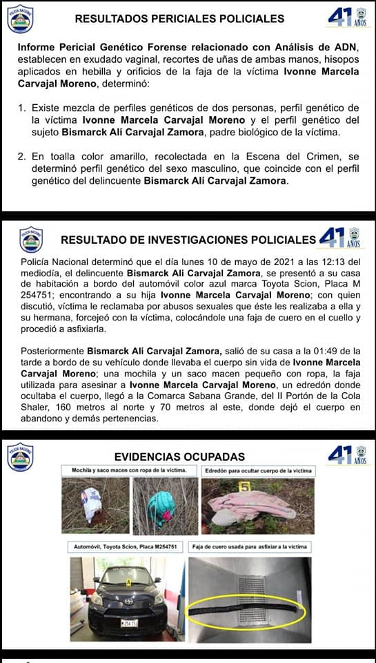 Bismarck Alí Carvajal Zamora, principal acusado por abusar sexualmente y luego asesinar a su propia hija, la joven Ivonne Marcela Carvajal Moreno, de 17 años, es un activo militante del FSLN; mientras la madre de la víctima es una expolicía retirada.
