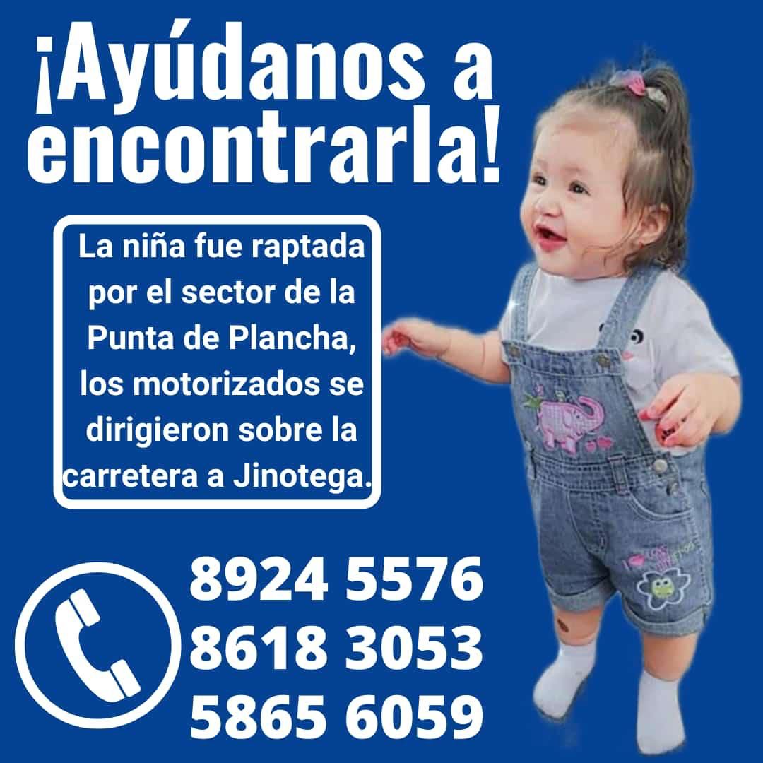 La mañana de hoy en en el sector de La Punta de Plancha, en Matagalpa, la niña de nombre Aitana Montserrat Lara Benavides, de tan sólo 11 meses de edad, quien estaba en su coche, dentro de la sala de su casa, fue raptada por dos sujetos desconocidos.