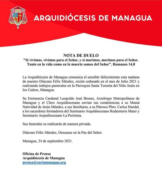 “Si vivimos, vivimos para el Señor, y si morimos, morimos para el Señor. Tanto en la vida como en la muerte somos del Señor”. Romanos 14.8 La Arquidiócesis de Managua comunica el sensible fallecimiento esta mañana de nuestro Diácono Félix Méndez, recién ordenado en el mes de Julio 2021 y realizando trabajos pastorales en la Parroquia Santa Teresita del Niño Jesús en los Cedros, Managua”, dice la nota de duelo.